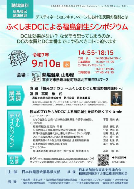 この「DC」について学ぶシンポジウムを開催します。主催は日本旅館協会福島県支部、当組合は共催させていただきました。詳細はリンク先のチラシをご覧下さい。